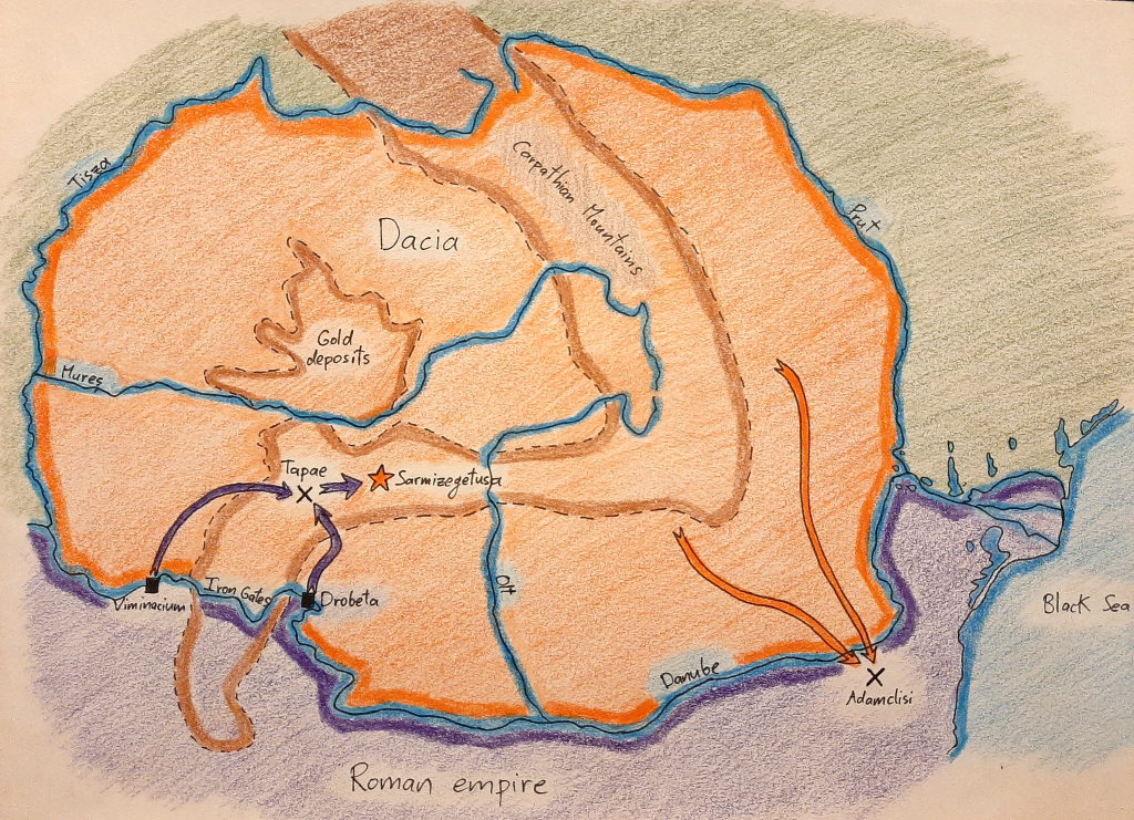 The map below shows the main sites of the war. The Romans launched their attack from Viminacium and Drobeta, two forts on either side of the Iron Gates. The pass at Tapae protected the way to the Dacian capital of Sarmizegetusa, while the gold deposits of the kingdom lay north of the capital. The Dacian diversionary attack came at a site called Adamclisi near the Black Sea.
