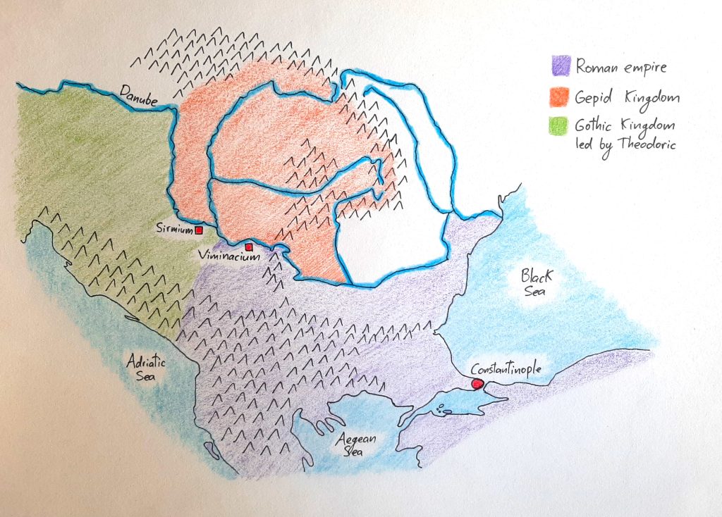 Below is a map of what the Balkans looked like in 493 CE. The Gepid kingdom included the lands of the original province of Dacia, plus territory to the west and north which hadn’t been part of the Roman empire.