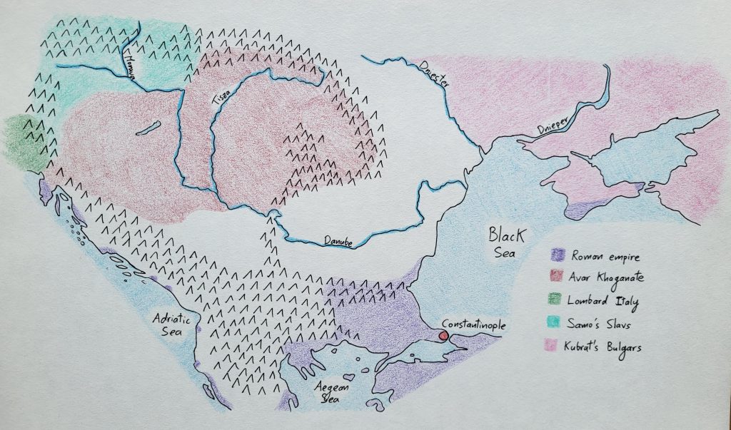 The Avar khaganate in 635 was much reduced compared to what it had been a decade earlier. Following the khagan’s defeat at Constatninople in 626, the Slavic clans in the West rebelled and elected Samo as their king, thus establishing an independent realm along the Morava River.